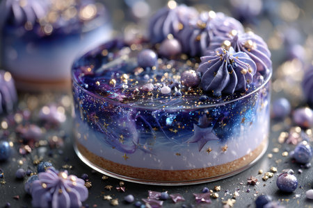 Yummy cake with galaxy colored cream and star shaped decoration placed on gray table