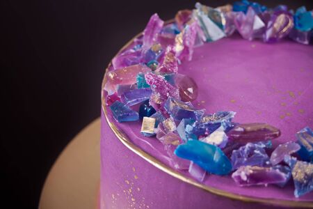 Violet purple cake with marmalade as amethysts trendy decor for cake. Close up.