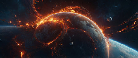 The image captures a planet partially engulfed in flames and lava, creating a dramatic fireball in the sky. The intense heat radiates outwards, illuminating the darkness of space with its fiery glow.
