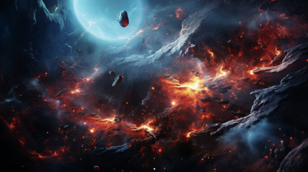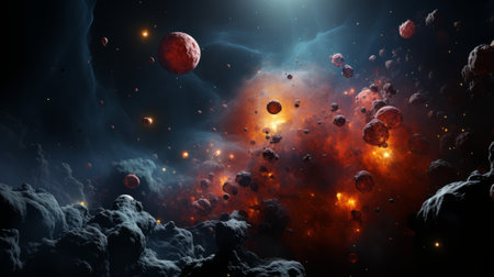 Abstract cosmic scene with glowing asteroids and colorful explosion in deep outer space.