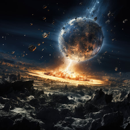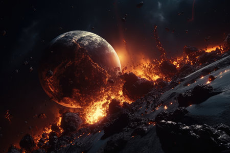 This image showcases a dynamic celestial event involving planetary fragmentation. Vivid oranges and blues dominate the composition, representing intense energy. The artwork portrays a cosmic scene with scattered debris amidst a starry background, suggesting vastness and power. Suitable for conceptual illustrations or science-related projects.