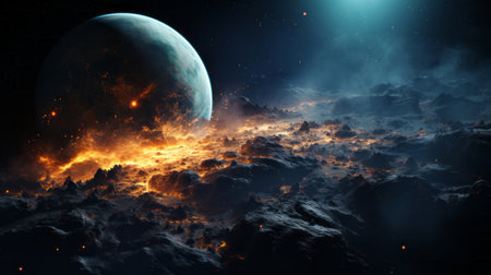 A planet in space with orange and blue colors . Generative AI.