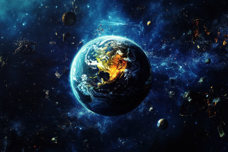 A captivating image of Earth viewed from space, showcasing its natural beauty surrounded by floating asteroids and cosmic debris, symbolizing exploration.