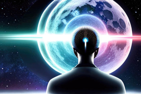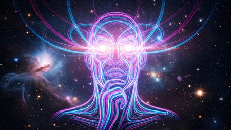 Visualizes a future where human evolution merges with cosmic elements, highlighting immortality