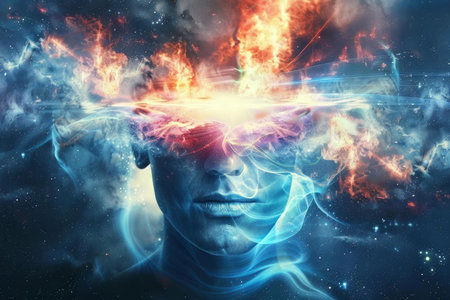 A man stands still, his head glowing with light amidst a mesmerizing swirl of cosmic patterns. The vibrant colors evoke a sense of deep introspection and enlightenment.