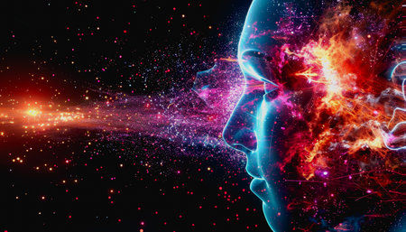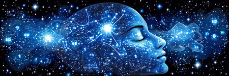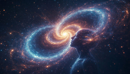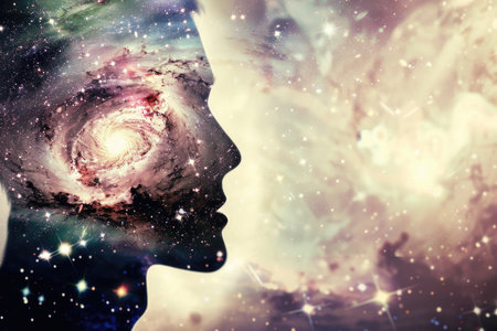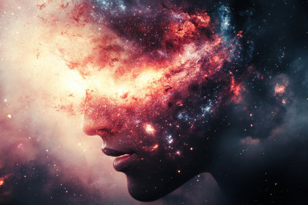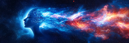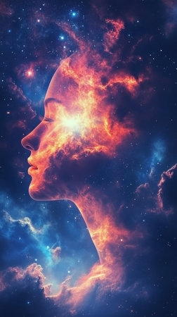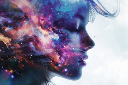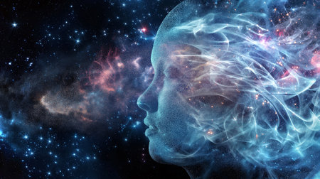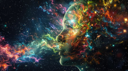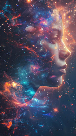 Profile silhouette merged with a cosmic nebula, featuring vibrant colors and ethereal patterns The background is a deep, starry space with swirling galaxies