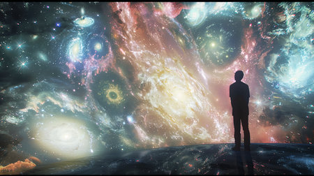 A breathtaking view of the galaxy with colorful nebulae and stars, as a silhouette gazes into the vastness of the cosmos