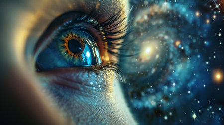 A woman has galaxy texture skin and bright blue eyes that reflect the universe. She looks ahead thoughtfully.