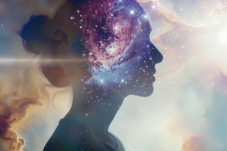 A silhouette of a woman blends with vibrant cosmic visuals, revealing a deep connection to the universe. An astronaut floats, exploring the mysteries within her mind during a serene twilight.