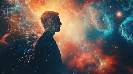 Silhouette of a man, filled with cosmic visuals and physics formulas, symbolizing the universe within and the balance of science and philosophy. Elements furnished by NASA
