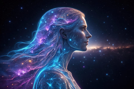 A visually striking depiction of a woman's silhouette blended with cosmic elements, symbolizing the universe.