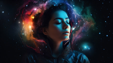 A woman's profile glows softly against a backdrop of swirling galaxies and colorful nebulae, creating a peaceful atmosphere that evokes wonder and introspection.
