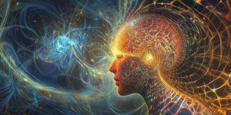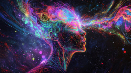 A man's profile glows with bright colors, surrounded by swirling cosmic elements. The aura suggests creativity, inspiration, and the power of imagination in a surreal setting.