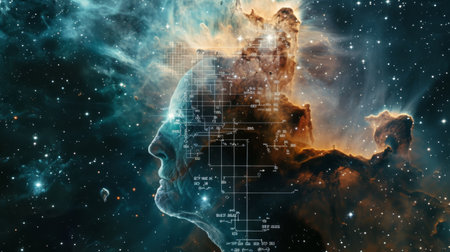A manaes silhouette merged with cosmic imagery, including galaxies and mathematical formulas, representing the vast universe within each individual. Elements furnished by NASA