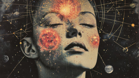 This artwork features a woman's face radiating a surreal glow, intertwined with cosmic elements and celestial bodies, creating a dreamlike experience that captivates the viewer.