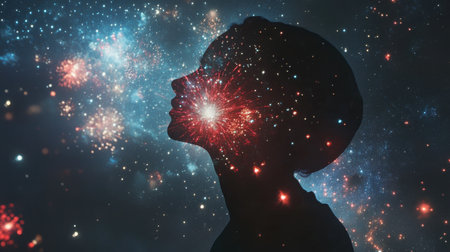 An outline of an individual's profile merges seamlessly with a vast, shimmering cosmos, illuminated by radiant flashes, symbolizing the connection between humanity and the universe.