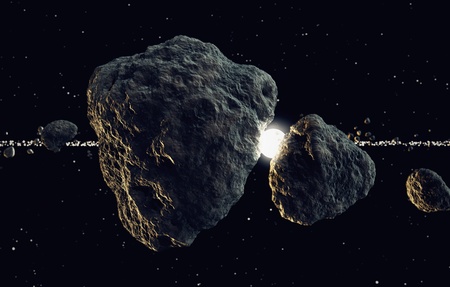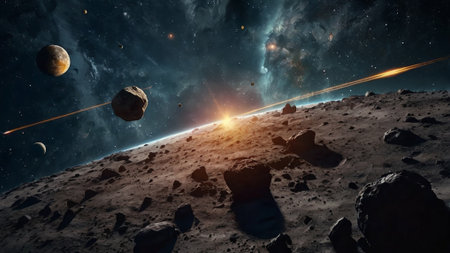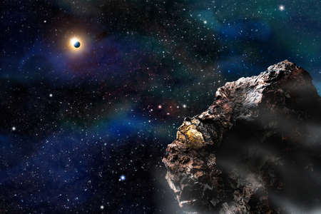 Closeup on meteor lumps and the sun that shines through in space. Suitable for any fantasy, astronomy or space realted purposes.