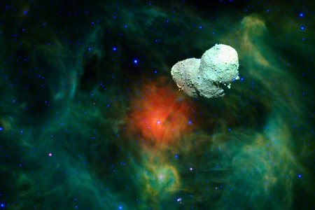 Mission to save the Earth from asteroid fall. Astronaut in space illuminates meteorite.