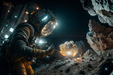 3D illustration of astronaut at asteroid field in deep space. 5K realistic science fiction art.