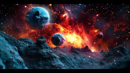 Space scene. Planet with asteroid and colorful fractal nebula.