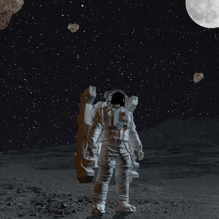 Astronaut in outer space, on an unknown planet over dark starry background. 3d rendering. Concept of research, art, challenges