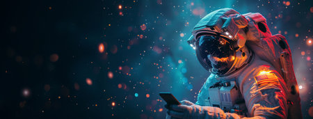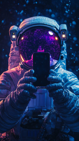 Astronaut in spacesuit holding mobile phone