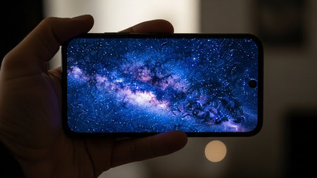 A hand holds a smartphone displaying a breathtaking image of the Milky Way galaxy, showcasing the beauty of the cosmos.