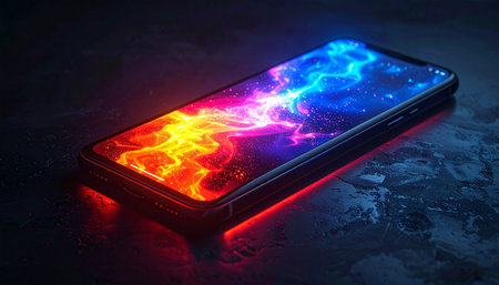 A sleek smartphone rests on a textured surface, exhibiting colorful reflections and a vibrant atmosphere. Ideal for technology and lifestyle themes.