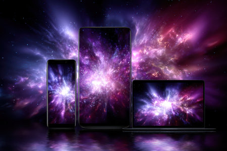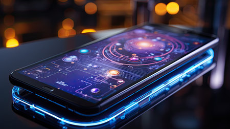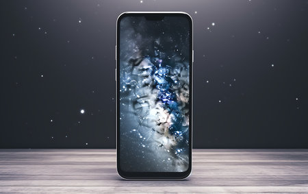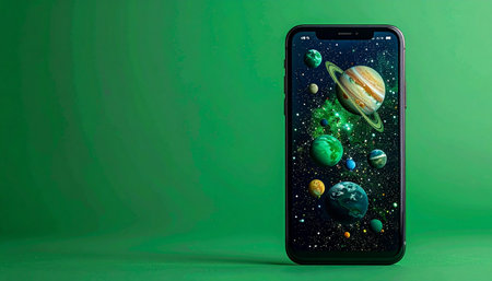 A modern smartphone stands against a neutral background, its vibrant screen a portal to the cosmos.