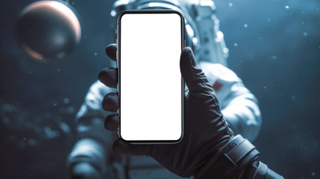 An astronaut holding smartphone with empty white screen in front of him in open space