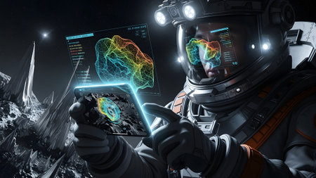 Astronaut using advanced holographic technology for neurological data analysis on an alien world