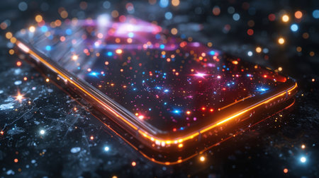 A sleek smartphone rests on a dark surface, emitting vibrant colors and ethereal sparks. The glowing display radiates hues of pink and blue, creating a captivating visual effect.