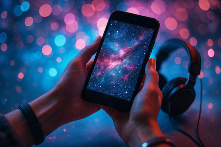 AI generated fantasy digital smartphone scene with glowing galaxy on screen surrounded by pink and blue bokeh lights and headphones symbolizing imagination creativity technology and modern lifestyle