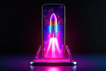 Rocket coming out of smartphone screen , neon light. beautiful Generative AI AIG32