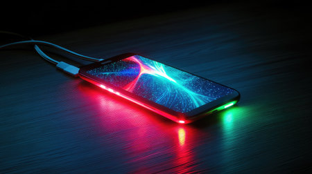 A fast-charging cable connected to a smartphone with dynamic light effects indicating power flow