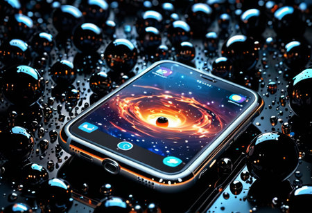A smartphone lies amidst reflective spheres, its screen showcasing a swirling galaxy. The image represents the intersection of technology and cosmos. AI generation