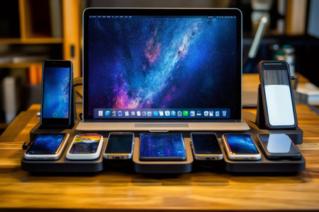 Multiple smartphones and devices charging on a wireless charging station on a desk, with a laptop displaying battery status