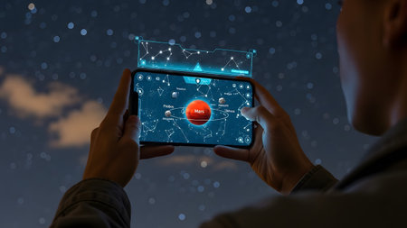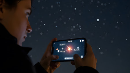 Person interacts with a smartphone app showing Mars and its moons in the night sky. Clear details...
