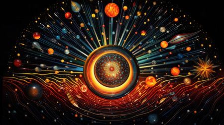 A painting of a sun with planets surrounding it, AI