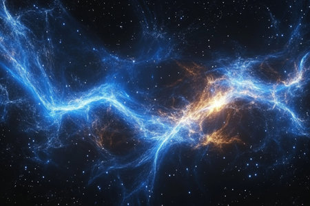 Vibrant abstract background showcases swirling blue and orange light patterns, evoking a cosmic atmosphere ideal for artistic design and creativity