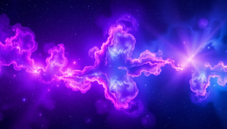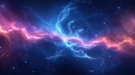 A vibrant abstract nebula in deep space with swirling pink, blue, and purple hues. A cosmic scene filled with stars and glowing particles, representing space and astronomy concepts.