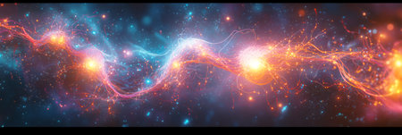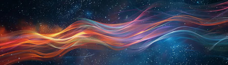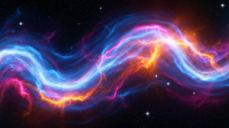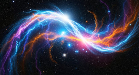 Dynamic abstract nebula with colorful energy streaks moving through a dark, star filled universe