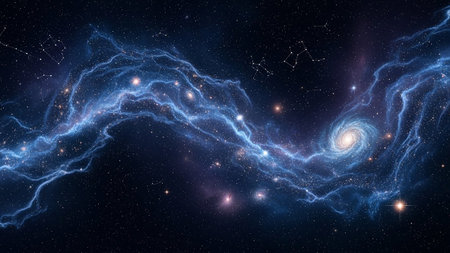 A swirling stream of blue cosmic energy flows through the vastness of space, adorned with bright stars, distant galaxies, and visible constellations. The luminous, intricate patterns of the energy stream create a sense of dynamic motion and immense power. This abstract depiction of the universe is both awe-inspiring and visually highlighting the beauty of celestial formations.