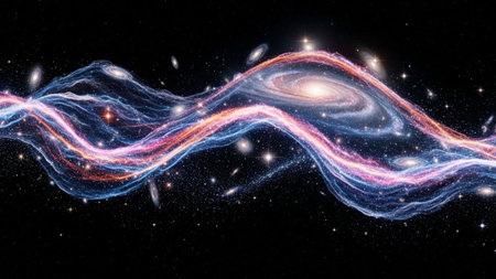 A vibrant cosmic nebula with swirling galaxies and energetic waves of blue and pink light illuminates the starry...