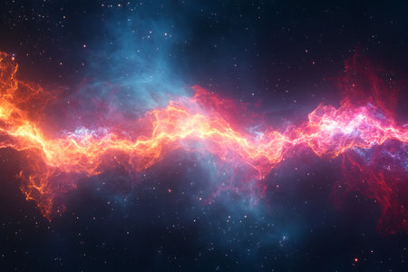A vibrant cosmic scene depicting a collision of blue and red energy beams within a colorful nebula.