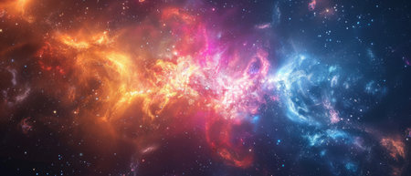 A vibrant cosmic nebula with swirling blue, pink, and orange gases illuminates the dark expanse of space dotted with...