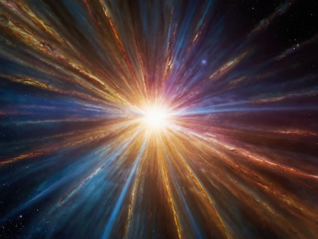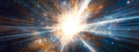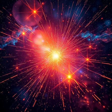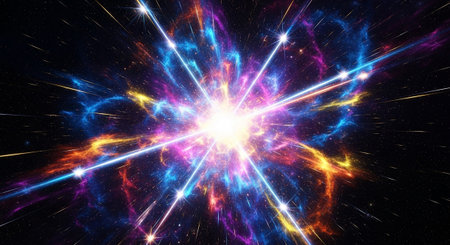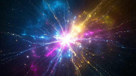A brilliant starburst explosion of colorful light particles emanates from a bright center against a dark, star-filled cosmic background.