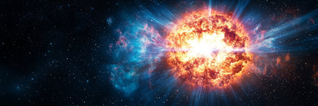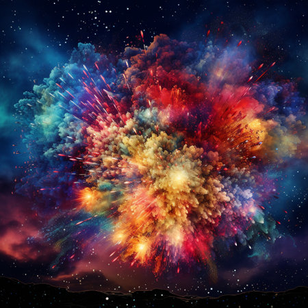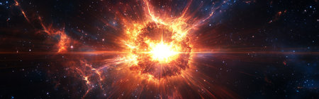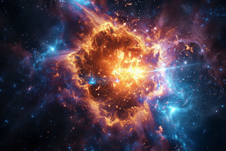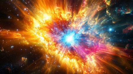 A vibrant explosion bursts forth in the cosmos, radiating fiery colors and energy across the dark expanse, showing the beauty of astronomical phenomena.
