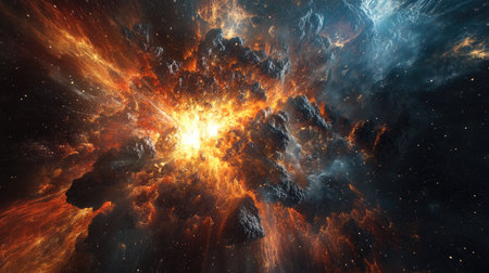 A fiery explosion in space, surrounded by swirling clouds of gas and dust.