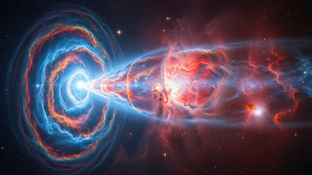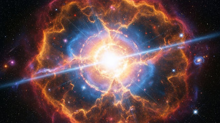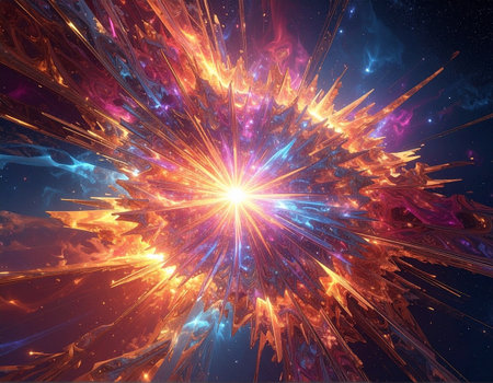 A vibrant explosion occurs in space, showing brilliant colors and cosmic energy during a stellar event.